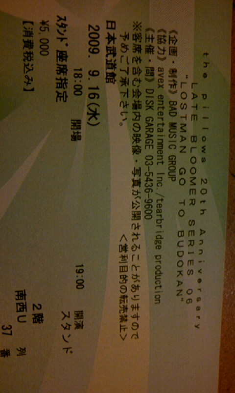 さぁー タイトル見ただけでピンと来たかなー 2009,9,16、20THアニバーサリー そう ピロウズの 20周年記念日!! オレの生きてる時より長いんだよ!! そんな916に 晴れて武道館で ライブをするわけなんですが……… チケット先行予約落ちたよー(ToT) 行きたいよー と願っていたら……… ………あるルートでゲットしちゃいました♪ しかも2枚1組!! 誰と行こうかな、悩むな………。 |